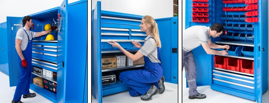 Ayarlanabilir raf sistemleri, çekmeceli ve avadanlık kutulu modüler seçeneklerinin yanı sıra askı panosu ve pleksi kapı opsiyonları ile endüstriyel malzeme dolapları, işletmelerin iş akışını hızlandırır ve düzeni artırır. Kilitli yapı sayesinde güvenlik sunarken, şeffaf pleksi kapı ile içerideki malzemelerin kolayca görülmesine olanak tanır ve ergonomik tasarımıyla hızlı erişim sağlar.